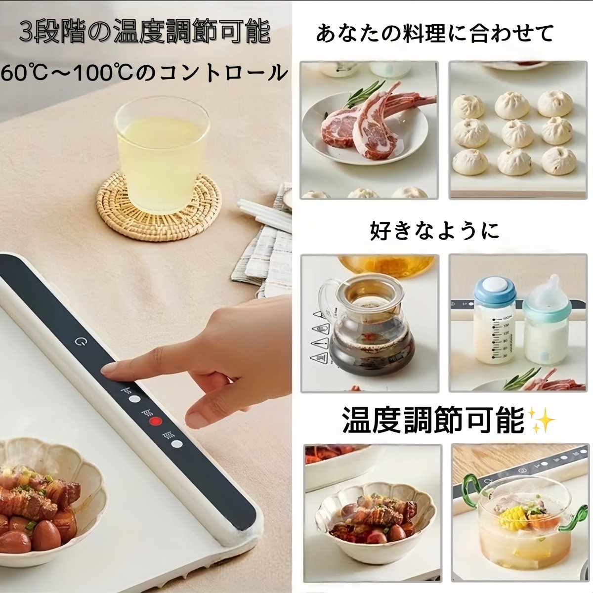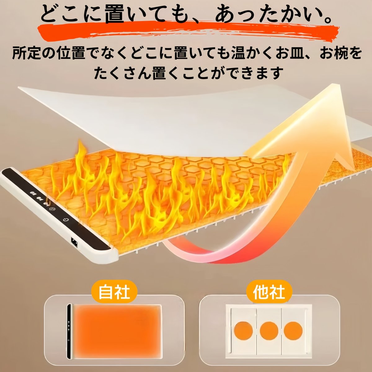 所定の位置にこだわらず自由に置ける設計。お皿やお椀をたくさん置いても温かさはそのまま。毎日の食卓やデスクでも快適に使えます。