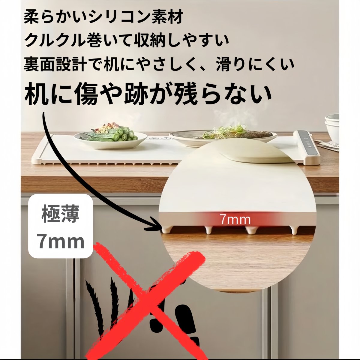極薄わずか7mmのシリコンマットで机をスマートに保護。柔らかい素材でクルッと巻いて簡単収納OK。裏面には滑り止め付きでズレず、断熱構造で安心。